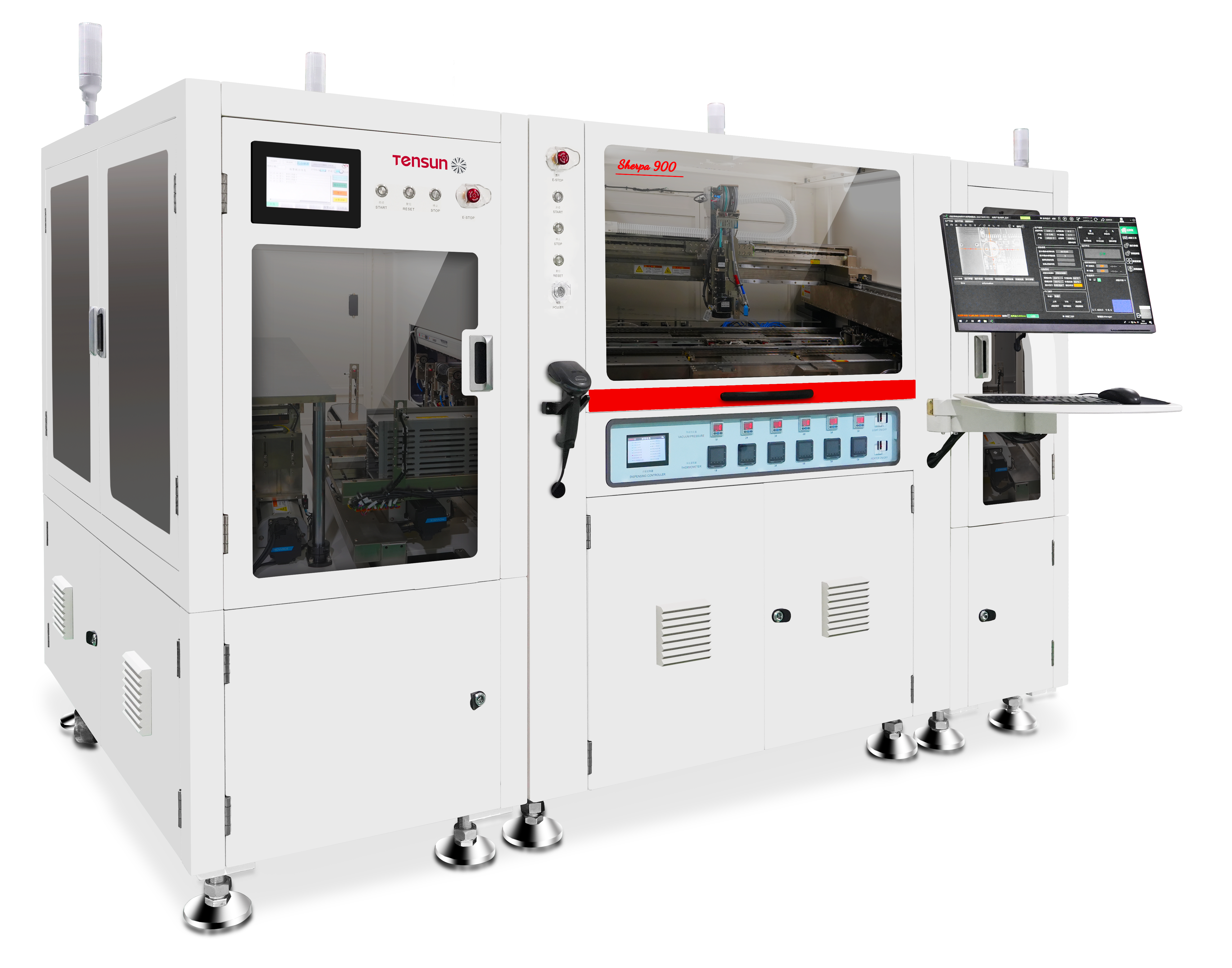 底部填充點膠機Sherpa900:針對CoWoS、2.5D/3D封裝等高端工藝研發,以微米級點膠精度實現底部填充的均勻覆蓋,有效避免氣泡、漏膠等行業難題,保障芯片在復雜工況下的穩定性與可靠性,是先進封裝領域的 “精度守護者”;